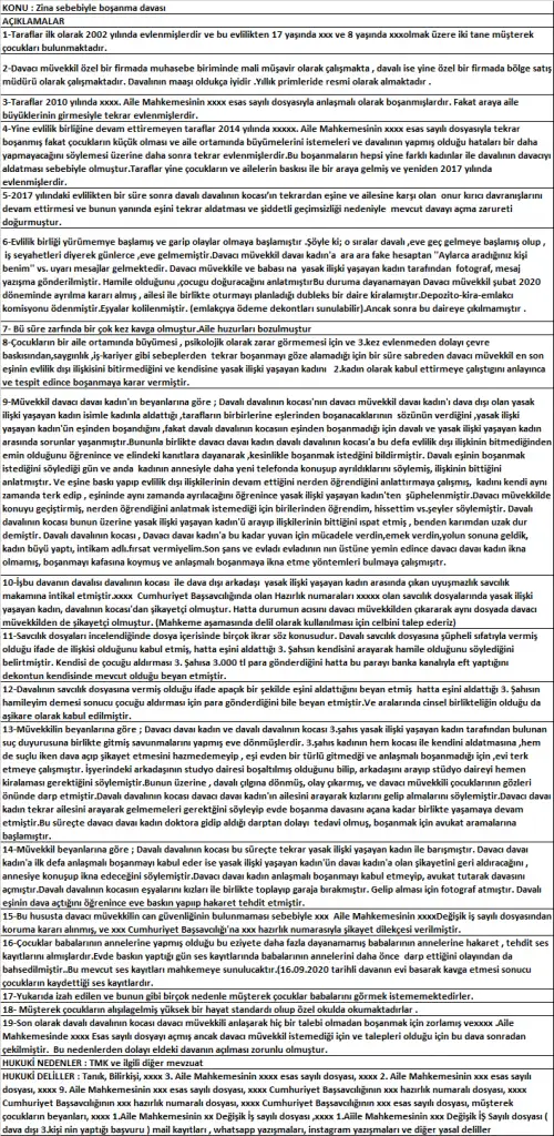 | 8-Çocukların bir aile ortamında büyümesi , psikolojik olarak zarar görmemesi için ve 3.kez evlenmeden dolayı çevre baskısından,saygınlık ,iş-kariyer gibi sebeplerden tekrar boşanmayı göze alamadığı için bir süre sabreden davacı müvekkil en son eşinin evlilik dışı ilişkisini bitirmediğini ve kendisine yasak ilişki yaşayan kadını 2.kadın olarak kabul ettirmeye çalıştıgını anlayınca ve tespit edince boşanmaya karar vermiştir. |