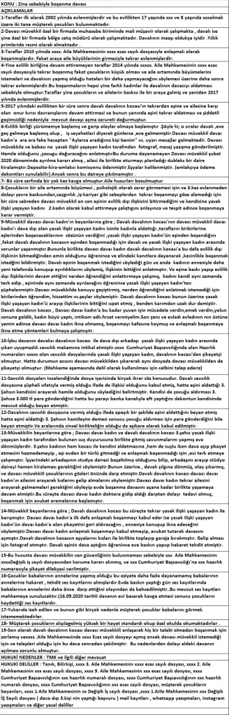 | 12-Davalının savcılık dosyasına vermiş olduğu ifade apaçık bir şekilde eşini aldattığını beyan etmiş hatta eşini aldattığı 3. Şahısın hamileyim demesi sonucu çocuğu aldırması için para gönderdiğini bile beyan etmiştir.Ve aralarında cinsel birlikteliğin olduğu da aşikare olarak kabul edilmiştir. |