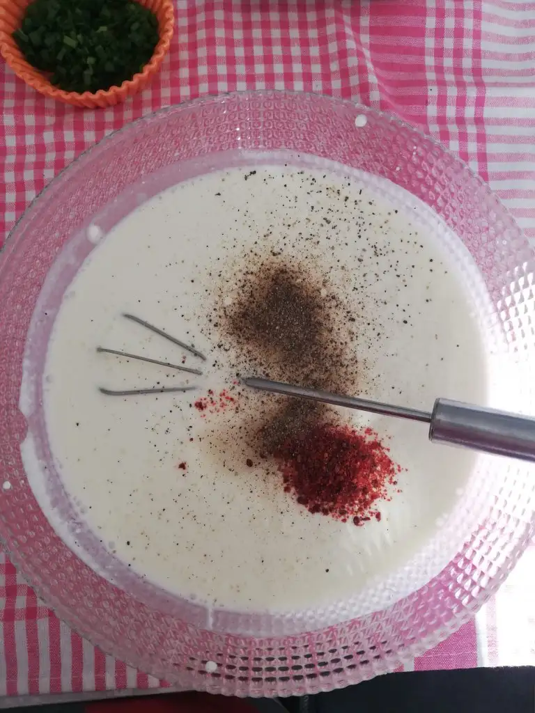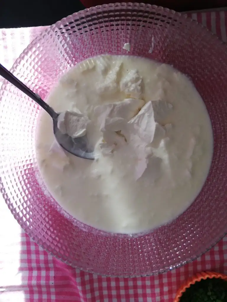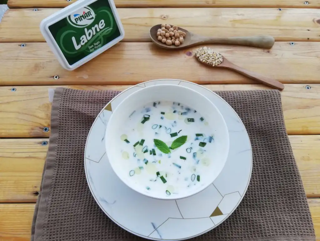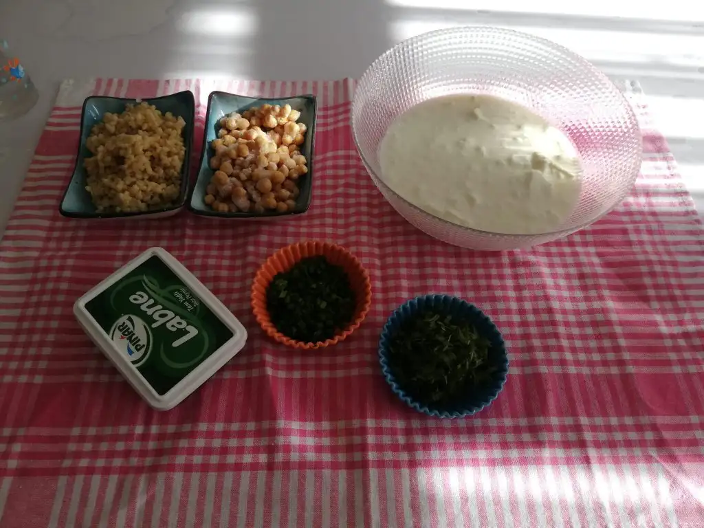 Yapılışı çok pratik. Labne ve yoğurdu pürüzsüz bir kıvam alana kadar çırpalım. Koyu kıvamdaysa(ki ben ev yoğurdunun suyundan da kattığım için 1 su bardağı kadar su kattım) 2 su bardağı kadar su ekledim. Yine de siz kontrollü katın. Tuz karabiber pulbiberini de ekledikten sonra tekrar karıştırdım. Ve en son nohut ve buğdayları da katarak son kez karıştırdım ve dolaba kaldırdım.