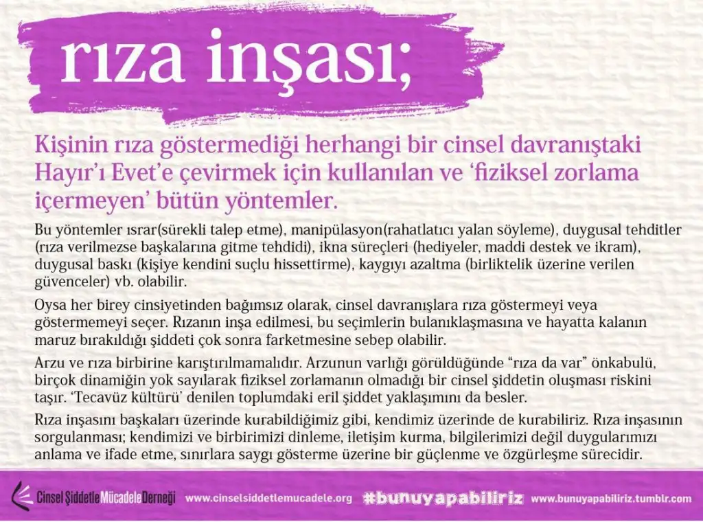 Cereser, rıza inşası kavramını biraz açar mısınız acaba?Rıza inşası yapmış. Bu da bir cinsel saldırıdır. Bir daha bu kişiyle bir araya gelmeyin, rızanın ne olduğundan haberi yok.