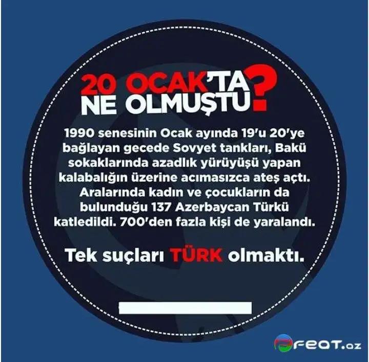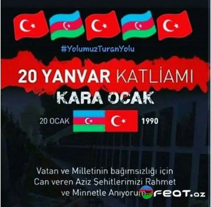 Yenə bir qanlı yanvar səhəri, Allah Şəhidlərimizə rəhmət eləsin, ruhları şad olsun. Bu cinayəti törədənlərin, baiskarların Allah özü cəzasını versin İn şə Allah. Mənim də şəhid qohumum var, nə deyim danışmağa sözüm çoxdur, amma yazmaqnan qurtarmar. Allah bütün müsəlman və bütün Türk dünyasını qorusun. İrqindən asılı olmayaraq heç bir günahsız körpə, qadın, yaşlı, heç bir günahsız ölməsin artıq. Silahlar sussun, insanlar bir dayansın, nəyin davasıdır bu, handı malın mülkün davasıdır ki, dünyada sülh ilə yaşamaq varkən, top tüfəng səsi, qorxu içində yaşayır insanlar.