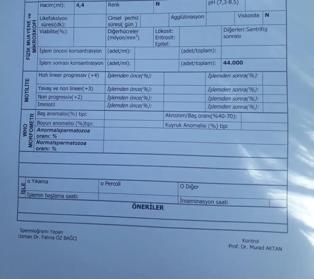 Maşallah çok sevindim insallah bizimde birden düzelir sonuclarimizCanim ilk testimiz 0 dı . Hastane degistrdik orda 1-2 tane motil sperm cikti .3 cüye baska hastaneye gittik bugun test verdigimizde 44.000 olmus tabi bu arada vitamin kullandik 1 ay proxeed ,e vitamini,çakşır suyu .