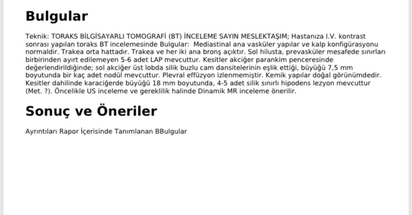 - Bunlar metastaz (kanser yayılımı) olabilir mi? Rapor bu konuda “Met.?” (Metastaz?) şeklinde bir soru işareti koymuş, yani kesin bir değerlendirme yapılmamış.