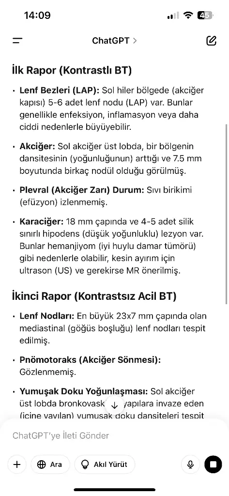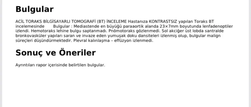 - Sol akciğer üst lobda "silik buzlu cam dansiteleri" ve nodüller mevcut: