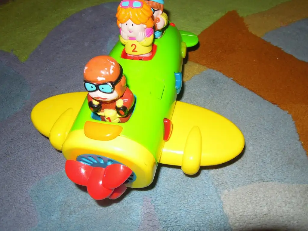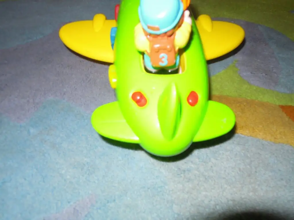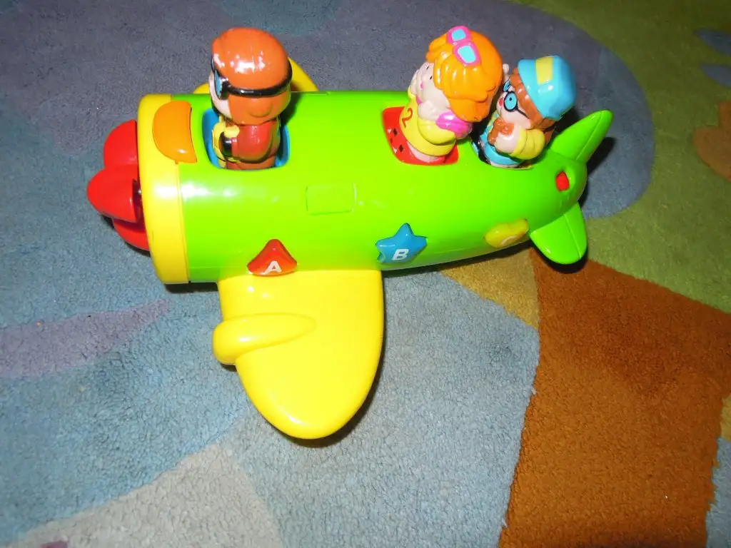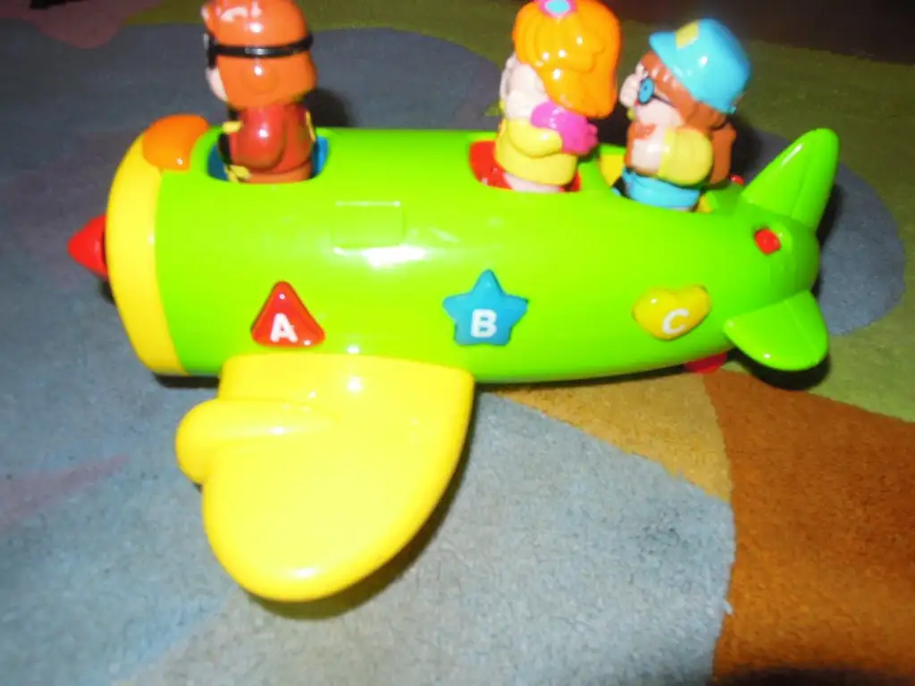 müzikli ışıklı eğitici uçak.yanlardaki tuşlar harfleri öğretiyor.üzerindeki insanlar çıkıp takılıyor.doğru yere taktığınızda yani 1 2 3 sırasına göre sesler çıkarıyor.çok fonksiyonlu eğitici bir oyuncak daha.biz yine kullanmadık:( pilleri içinde kullanamdığımız için birçoğunun pilleri sıfıra yakın.3o tl