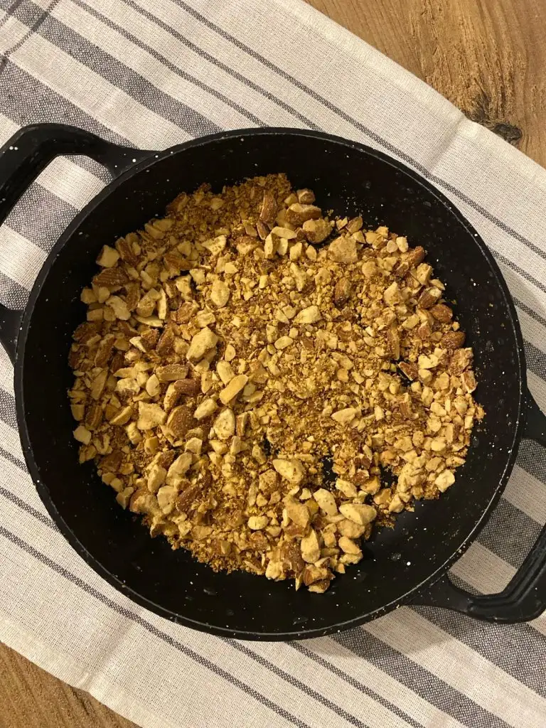 Bademleri havanla döverek kırıyoruz parçalı kalacak şekilde olacak toz haline getirmiyoruz Kısık ateşte kontrollü şekilde kavuruyoruz yanabilir.Hafif rengi değişince kenara alıp soğumaya bırakıyoruz.