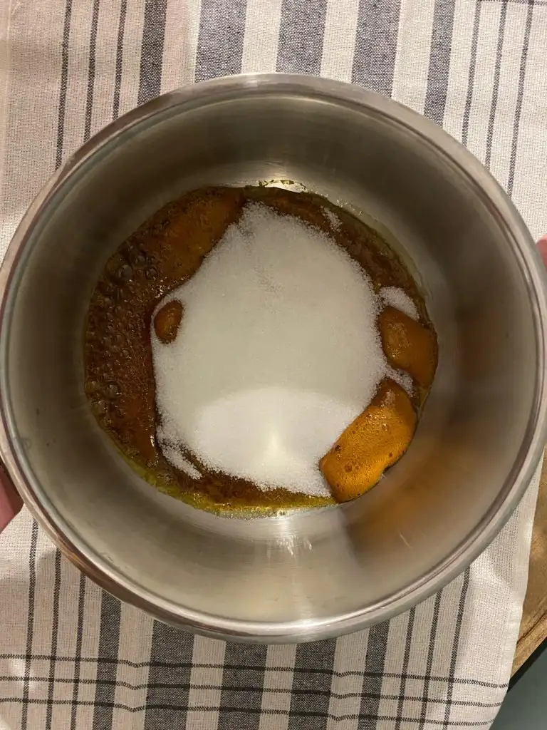 Tencereye şekeri alıp kenarlarından hafif erimeye başlayıncaya kadar karıştırmadan ocakta tutuyoruz.