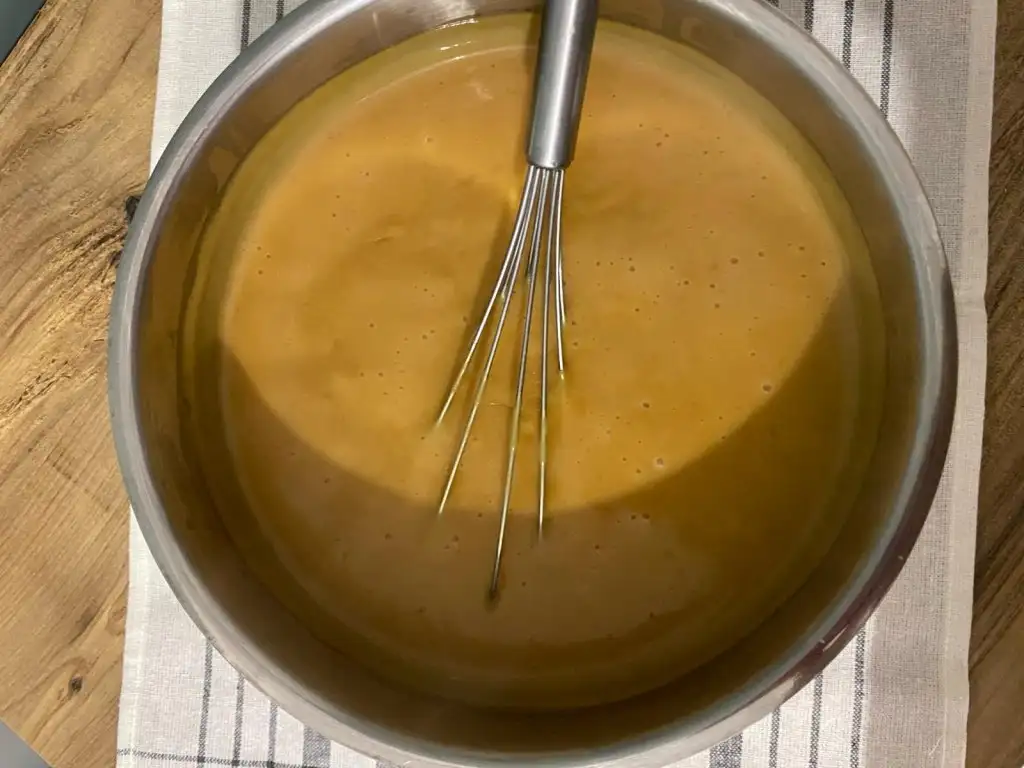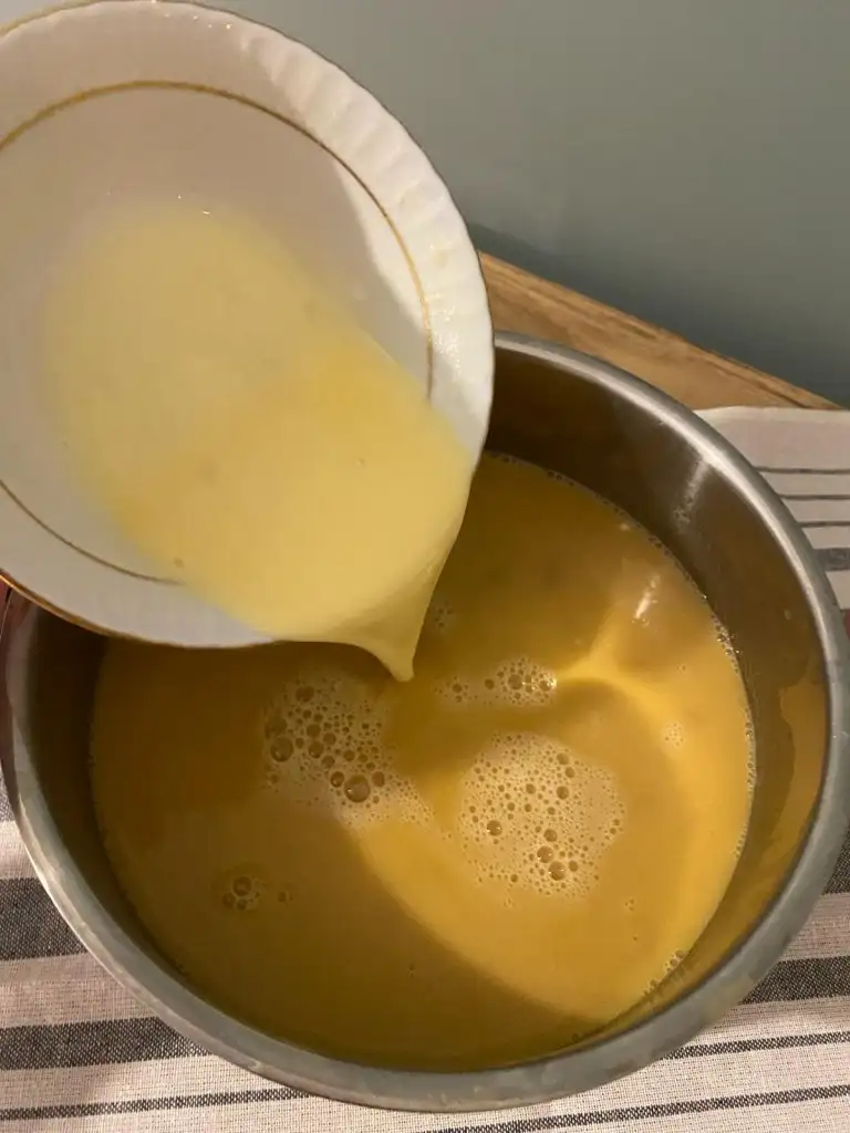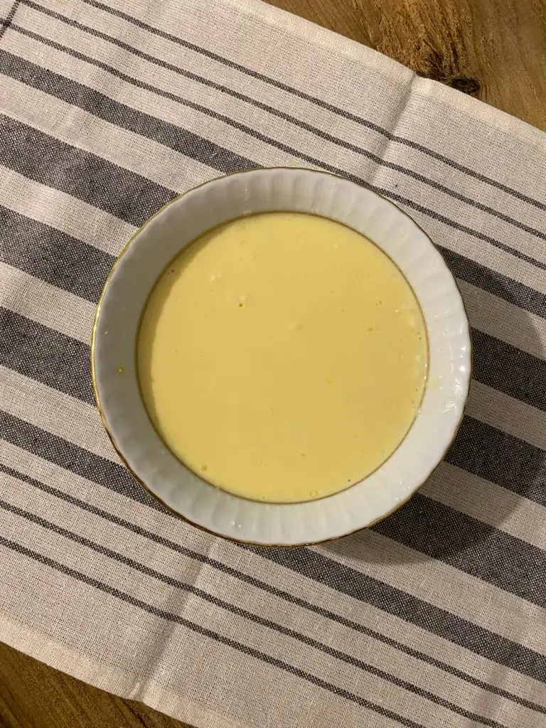 Ayrı bir yerde ayırmış olduğumuz 1 çay bardağı süt, nişasta, un ve yumurtayı iyice çırpıyoruz.