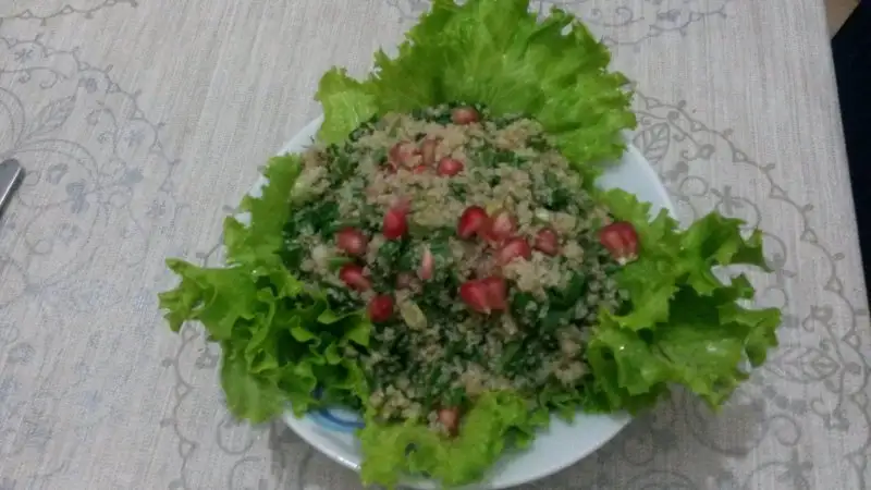 Dinlenmiş bulgur a yeşilliklerimizi yağımızı tuzumuzu ve narımızı ekleyip harmanlıyoruz ve kıvırcıkların içinde servise hazır hale getiriyoruz.