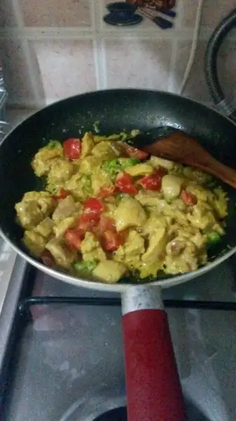 Yaklaşık yarım saat sosunda marine olan tavuğumuz tekrar ateşe alıyoruz 15 dk kapağı kapalı piştikten sonra doğramış olduğumuz domates ve biberimizide ekiyoruz ve kapaksız bir şekilde soteliyoruz. tolamda 30 dk yeterli oluyor pişmesi için.