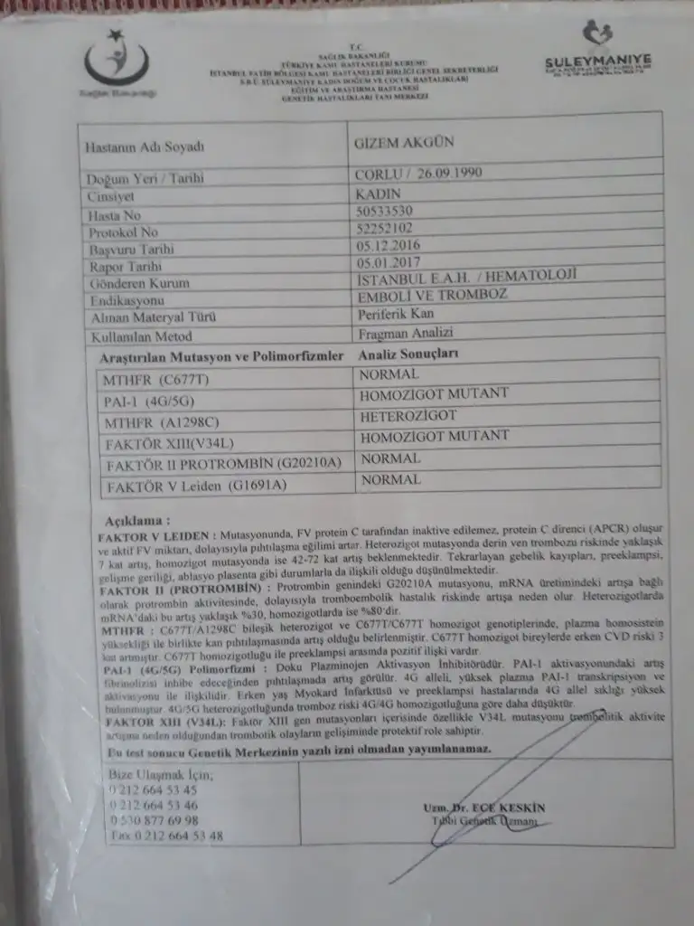 BUNLAR HEP GEN TESTLERİ bu testler homozigot ya da heterozigot çıkarsa kan pıhtılaşması eğilimi oluyormuş ve bebeğin kalbi duruyormuş. bunun için transferden hemen sonra kan sulandırıcı iğne oksapar ve coraspin hap kullanılması gerekiyormuş.