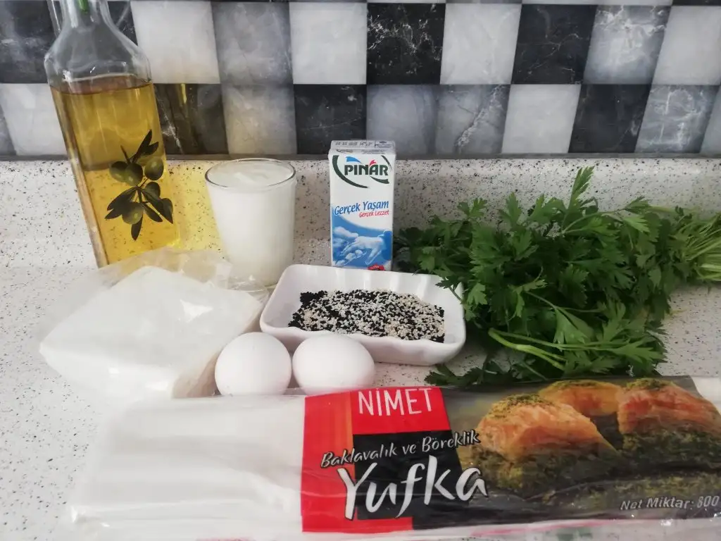 1- 1 paket baklavalık yufka 2- 1 su bardağı yoğurt 3- yarım su bardağı süt 4- yarım çay bardağı sıvı yağ 5- 2 yumurta akı ( sarısını üstüne sürülecek) 6- İç harcı için Peynir ve Maydanoz (isteğe bağlı çökelekte kullanabilirsiniz) 7- Üzeri için siyah ve beyaz susam (isteğe bağlı çörek otu kullanabilirsiniz)