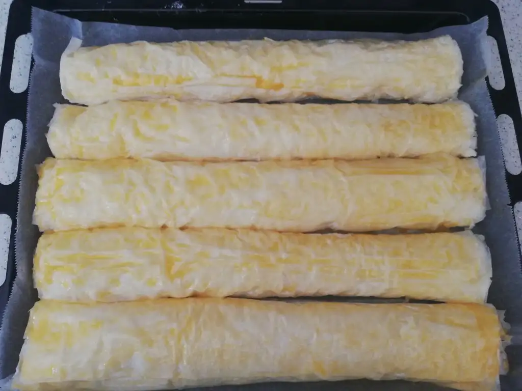 Yani toplamda 6 yufkada bir iç koyup sarıyoruz 2 ser kat olan yufkanın aralarına da sos sürüyoruz