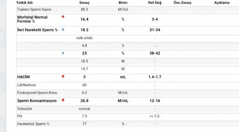 Amin cümlemizden. Sayı ve morfoloji güzel de ileri hızlı biraz daha artmalı. Bi de hareketsiz çok var. Çakşır da keçiboynuzu da mucize gibi mutlaka artış olmuştur canım.Canım seninle gecenlerde de konuşmuştuk yardimci olmuştum bana. Allah razı olsun. Bu da benim eşimin sperm test sonucu. İki ay oldu yaptırali. Bir aydır hergun keçiboynuzu özü ve çakşır suyu icio. Artmıştır heralde biraz.