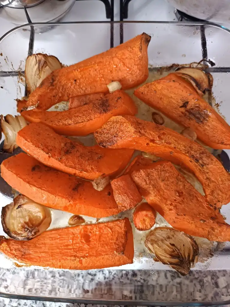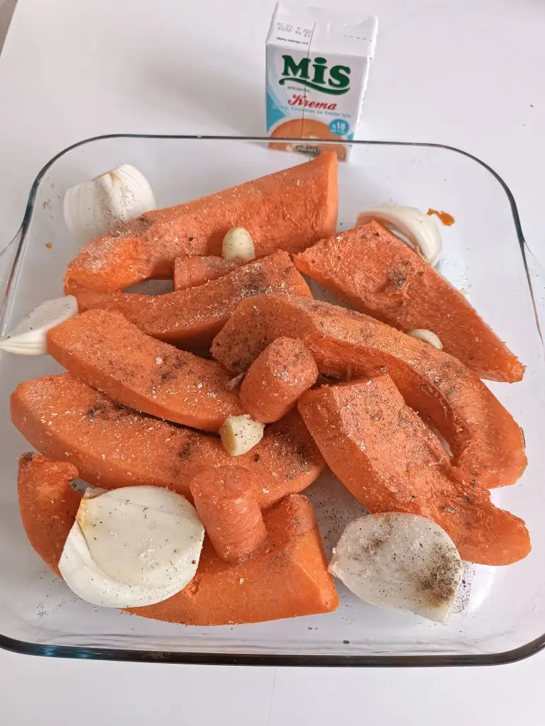 Krema hariç bütün malzemeleri fırın kabına koyup üzerine tuz, karabiber ve sıvıyağ gezdirip 200 derece fırında pişiriyoruz.