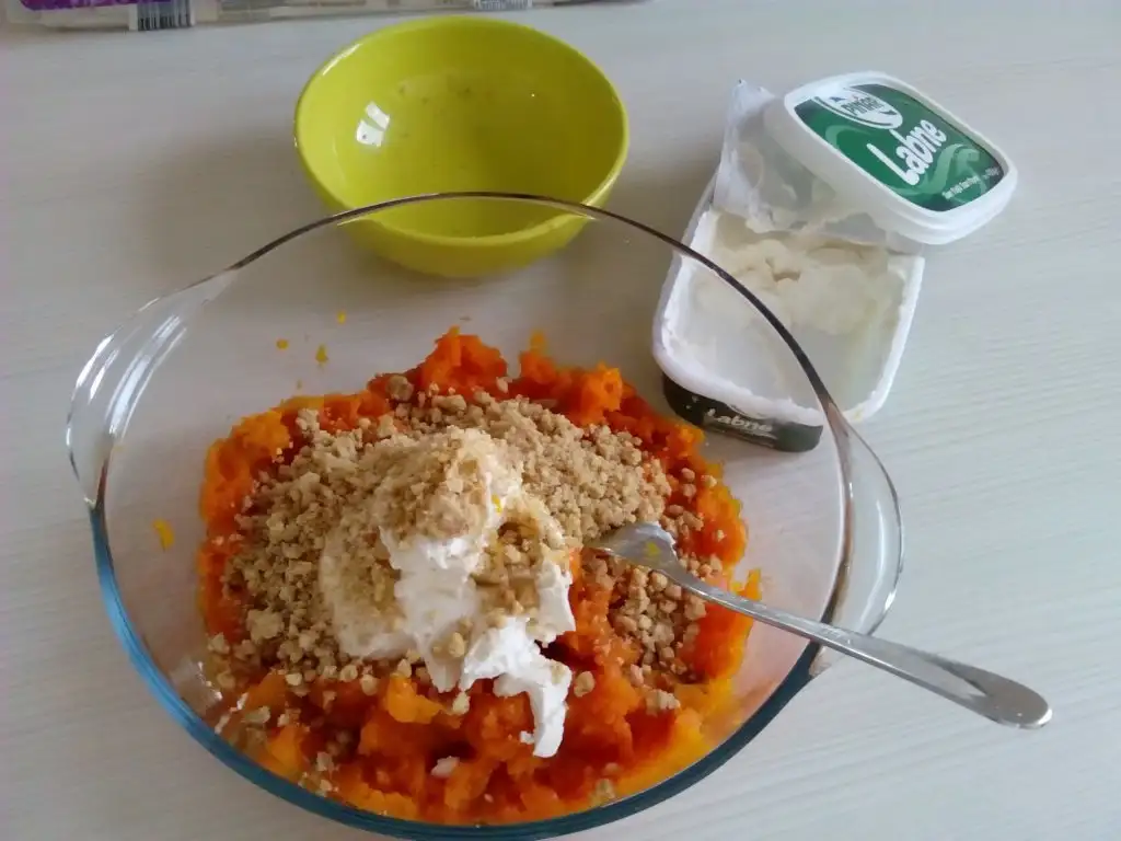 Soğuyan kabağın üzerine 200 gr Pınar Labne, ceviz ve tarçın eklenir.