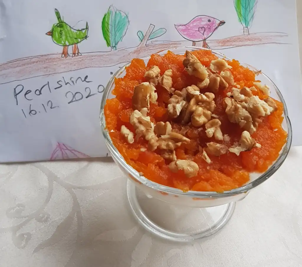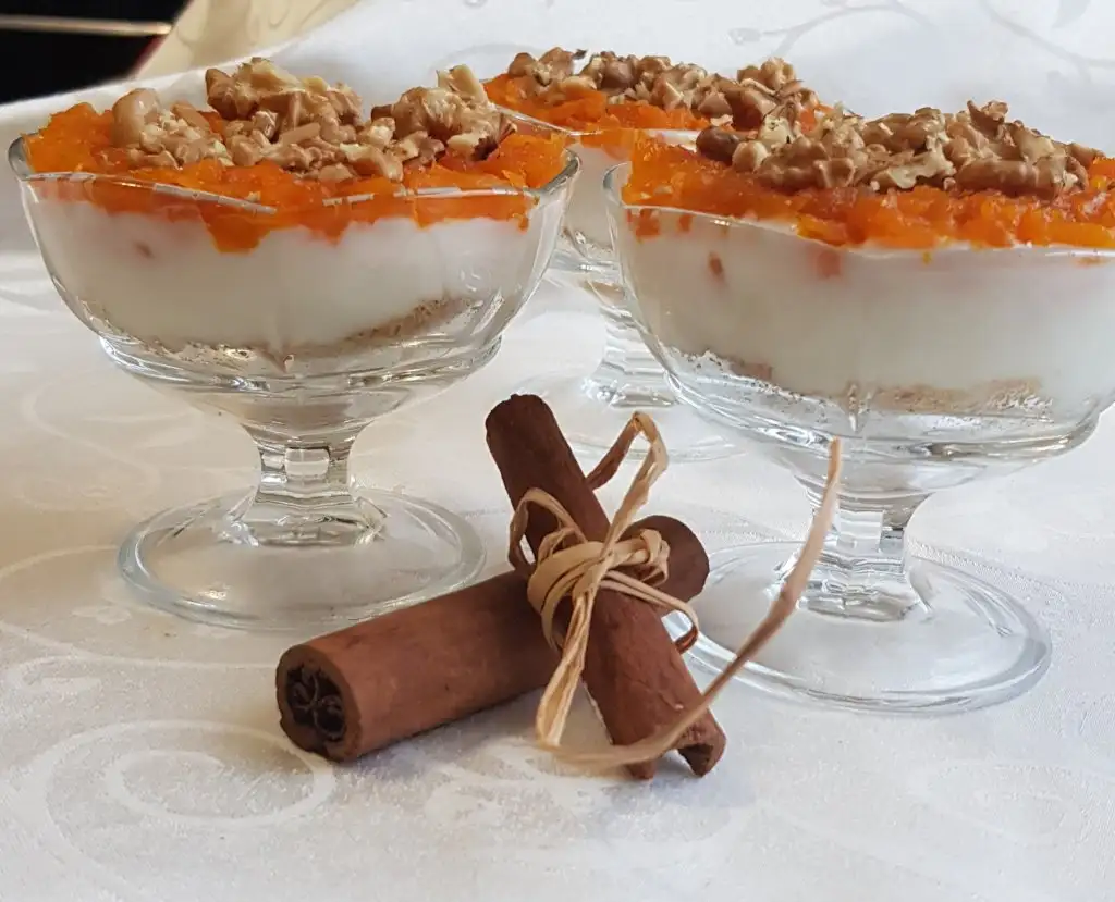 En alta burçak bisküvileri ufalayalım, araya muhallebi koyalım, üstüne normal kabak tatlısı gibi pişirdiğimiz kabakları püre yapıp yayalım. En üste de ceviz serpip dolapta soğuttuktan sonra servis yapalım. Afiyet olsun
