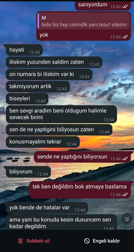 Arkadaşlar ben Konya'da yaşıyorum 18 yaşındayım 2023 yılında sosyalleşme oyununda bir oğlanla tanıştım benden bir yaş büyük ve İstanbul'da yaşıyor kendisiyle samimi olduk ve sevgili olduk o zamanlar ağır ergenlikteydim onun için biraz deccal gibi davrandım oğlanın kalbini kırdım 2024 yazına kadar böyle sürdü bu durum daha sonra 2024 yazında temmuz Haziran gibi ben artık ona dönmeye başladım aklım başıma dank etti diyebiliriz kendisi Haziran ve temmuzda hani olur felan diyordu ama olmuyordu bir şekilde hatırlamıyorum konuşma kesiliyordu ben yaşıyordum yine Ağustos'ta yazdım bu sefer geceye kadar konuştuk kendisi geceleri uyumuyor gündüzleride çok geç kalkıyordu bende şaka manasında yenge mi var dedim sonra bana evet gerçekten biri var dedi ben de ciddi misin engelliyecegim yoksa dedim o beni engelledi sonra ulaştım bir şekilde bana açıklama yap dedim sana olan hislerim öldü dedi tartıştık biraz yine engelledi bundan sonra ben ona her ay yazmaya başladım ve benle konuştu hayatında başka biri olmasına rağmen bana süreklilik umut verdi (seni seviyorum diyor o zaman beraber olalım diyorum o kızı bırakamam diyor kız intihar felan edicekmis sanırım ondan dolayı terk edip kimsenin güvenini benim için kiramayacagini söyledi) ve kavga ediyorduk beni engelliyordu sonraki ay benim özlemim yine katlaniyordu yine yazıyordum bu böyle gitti benim doğum günüm Aralık'ta yazmadı doğum günümde ben yazdım yine orda bu sefer kavgalar hani bir üst seviyeye taşındı.Bakin ben suçluyum suçsuz değilim ama onunda suçu eğer sevgilin varsa bana neden umut veriyorsun? Onun peşinden kosmama en büyük sebep bu oldu en son cidden kırıcı konuşmaya başladı 2025 Ocak olmasi lazım ordan sonra mayisin sonuna kadar ona yazmadım istanbul depremi oldu küçük Mayıs'ta hatırlarsanız o zaman smsten yazmıştım ona engelimi açmış wpden bende yine yazdım (bu arada şey olmuştu kendisi Snap kullanmıyordu sonra Snap açmış bana bildirim geldi arkadaşımdada numarası vardı beni engellediği zaman profilini bana atsın diye vermiştim arkadaşımı eklemiş önerilerine çıktığı için neyse kıza yazmış felan bende dedim hani instgramini iste vericek mi bakalım çocuk ekledi arkadaşımı instgramdan ve hani saçma sapan şeyler konuşuyormus arkadaşım benim zorumla yazdı sonra kız çıkardı onu bitti bu konu böylelikle) sonra bu parantez içinde dediğim konuyu yüzüne vurdum kavga ettik baya ve hala bana iliskisini savunuyor? Snap hesabını üniversiteden bir arkadaşı onun kendi telefonundan açıp rastgele insanlar ekledigini söyledi saçmalık yani neyse ben engelledim bu sefer ilk olarak (bu arada tanistgimiz oyundan insanlara iste çok çirkin bir kız felan diyormuş bunuda sorunca laf açılmıştır demisimdir öyle dedi?)kendiside beni her yerden engellemiş şuan agustostayiz 20 Haziran'da Twitter'dan bir gönderiyi repostlamis ayrılmış büyük ihtimalle kızla o yönde bir şeydi, ben tarot fal tarzı şeylere inanan biriyim ve bir iki hafta önce birine baktırdım bu çocuk için ve donucek çıktı sonra 7-8 kişiye daha baktırdım onlarda donucek dedi çocuğu unutamıyorum sizce napmaliyim ve ne düşünüyorsunuz benim için cidden özel biriydi en sonki kavga sslerini koyacağım