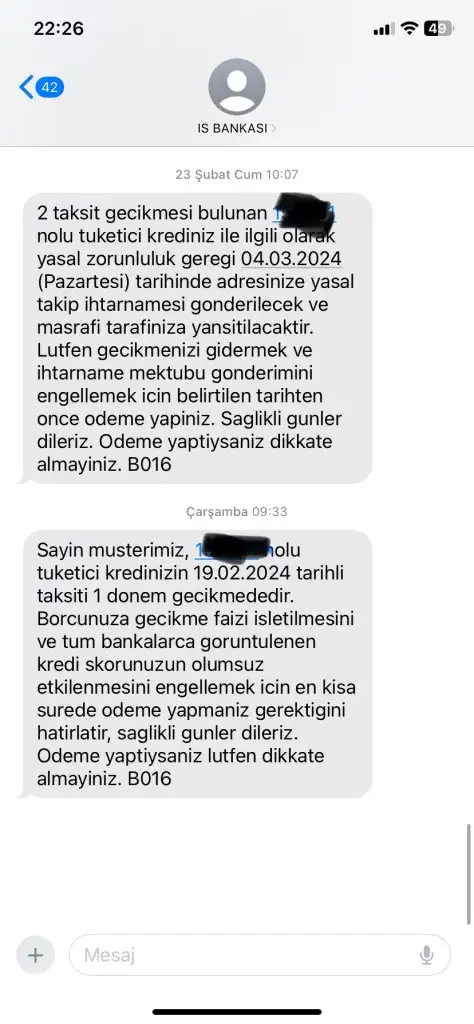 Merhabalar ,ödemesini geciktirdiğim 2 kredi ödemem vardı.23 şubatta bana mesaj geldi eğer 04.03.2024 tarihine kadar ödeme yapmazsanız yasal takip ihtarnamesi gönderilecek ,belirtilen tarihten önce ödeme yapınız diye mesaj geldi.Ben de mesajın geldiği gün bir ödememi yaptım geriye kalan diğer ödememi de bugün yaptım.ödeme yapmama rağmen yarın ihtarname gönderilir mi.lütfen yardımcı olur musunuz..