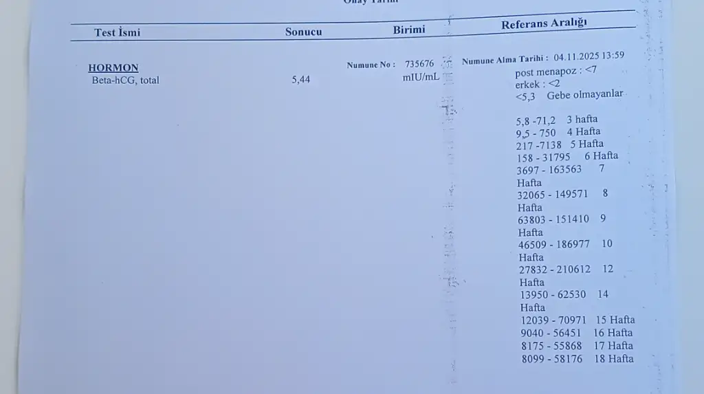 Kızlar bilen yok muuuSelam kizlar ben bugun kan verdim 5.44 cikti yumurtlama 22 ekimde idi degerlendirdik. Dr adet olursun gebelik yok dedi ama referans değeri 3 hafta 5.8 ile 72 yazıyor. Arada 0.44 fark var. Sizce napmam lazim?