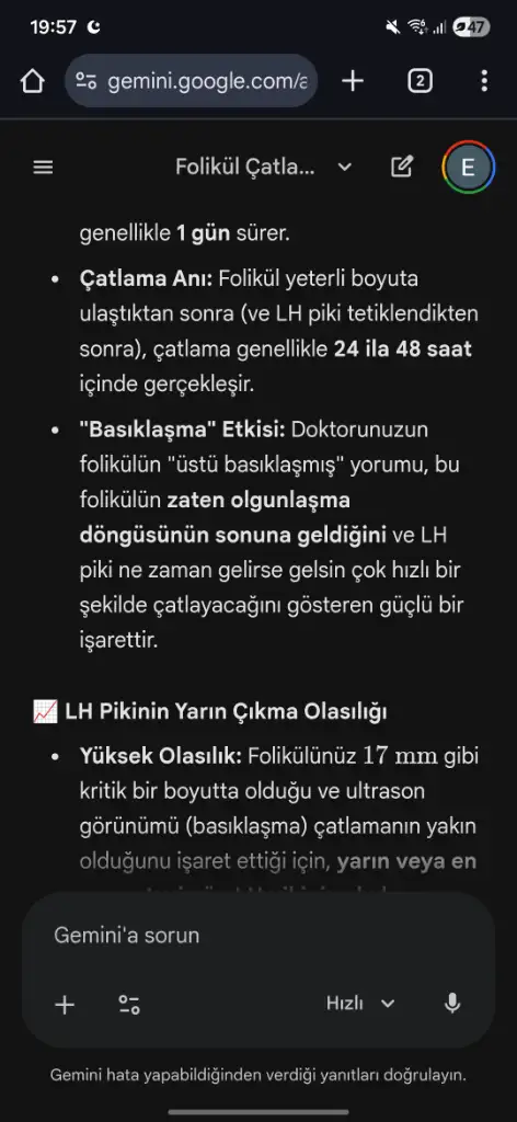 bence gayet iyi 17 mm ye göre testin normal aynen devam etAskim kadın doğuma gittim sağda 17 mm dominant folikül var dedi hafif basıklaşmış dedi bir yeri için daha bunun bir kaç gün vakti var dedi testimi de tekrar atim asko