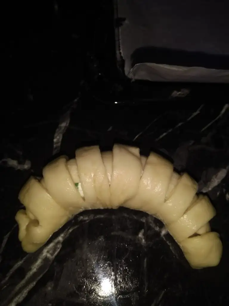 Açtığınız dairenin bir yarısına bir bıçak yardımıyla kesikler atın. Diğer yarısına hazırladığınız iç harçtan koyun ve her bir kesiği, iç harcın üstüne doğru kapatın.