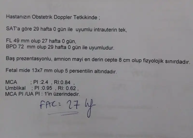 Benim bebeğinde o haftalarda karın çevresi 3 hafta gerilik vardı ayrıca suyuda sınırdaydı erken alma ihtimaline karşı ciğer geliştirici iğneler oldum her hafta nst ve ultrason takibi ve günde 5 litre su içerek 37. Haftada doğum yaptım~ çok şükür iyiyizMerhaba arkadaşlar. Ben bugün itibarı ile 29+2 hamileyim. İnşallah güzel bir kız annesi olacağım. 2 gün öncesine kadar hamilelik sürecim güzel geçiyordu. Daha doğrusu tam 1 ay önce doktora gittiğimde doktorum bebeğin midesini biraz küçük gördüğünü söyledi ve bir dahaki gelişimde kendisine bu konuyu hatırlatmamı söyledi. Bundan 2 gün önce gittiğim rutin kontrolde midesini tekrar küçük gözlemlediğini söyledi ve beni üniversite hastanesine renkli doppler çekimine gönderdi. Çekim sonrası bana verdikleri raporda da midenin küçük gözlemlendiği yazıyordu.Neyse sonuçları aldıktan sonra tekrar doktorun yanına gittiğimde kendisi raporu incelediğinde mideyi küçük gözlemlediği için gelişim geriliği olup olmadıgına bakılması için beni gönderdiğini, midenin gerçekten küçük göründüğünü fakat amniyotik sıvı ile kordon kan akış değerlerinin normal olduğunu söyledi ve tam bir yorum yapamayarak beni fakülte hastanesi doktorlarına yönlendirdi. Açıkçası huzursuzum biraz. Kızım son 1 ayda 640 gramdan 1100 grama çıkmış. İçim hiç rahat değil acaba bir sıkıntı var mı yoksa kızım sağlıklı mı. Rabbim yardım etsin. İnşallah bir aksilik olmak diye dua ediyorum. Bana verdikleri raporu da eklemeye çalışacagım belki siz de değerler hakkında yorum yapabilirsiniz.