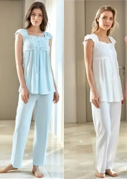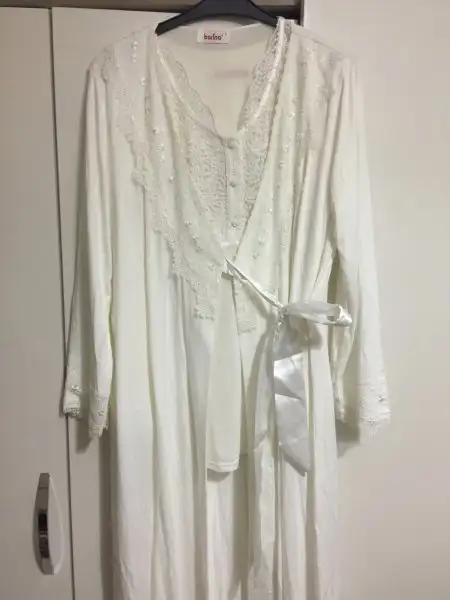Benimki de buna cok benziyor uzun versiyonu .Maalesef ic gosteriyor penyesi cok esnek.Canim 1 pijama bir gecelik mi koyacaksin ?.Ben oyle yapcaktim.Sonra sezeryan yapanlarin yorumlarina baktim ikisi yeterli olmamis o yuzden 1 gecelik 2 pijama takımı koyacağım.Uzun uzun alacağım diye kafama taktıktan sonra sonunda lohusa pijama ve geceliğimi aldım. Denedim güzel yumuşacık bir kumaşı var, Bone marka. Yalnız gördüğüm tüm diğer ürünler gibi biraz iç gösteriyor. Düşünen olursa fikir olması açısından paylaşıyorum. Geceliği ve sabahlığı turkuaz, pijama takımını da aynı modelin kırık beyaz renginden aldım. Beden olarak hamilelik öncesi M giyiyordum, bunda da M beden uydu.