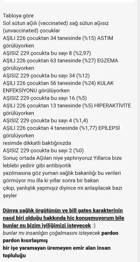 Çok kararsızım ya bilmiyorum aşılar hakkında ne kadat iyi şeyler söyleselerde bi o kadar kötü şeyler söylüyolar zaten aşının saati geçti napicam bilmiyorumÇıldıracağım :) kuzenim de ablam da bu kafadaydı, aşılar zararlıymış da tu pis kaka da, vücuda çok zararlıymış da... Tek bilgi kaynakları da Facebook'un ilkokul mezunu komplo teorisyenleri. Kuzenim öyle ki çocuğunu da evde doğurdu, öyle doktor ve hastane düşmanıydı. Bebeğin ne aşıları vardı ne topuk kanı alındı ne sağlık ocağı muayenelerine gitti. Sonuç ne mi oldu?