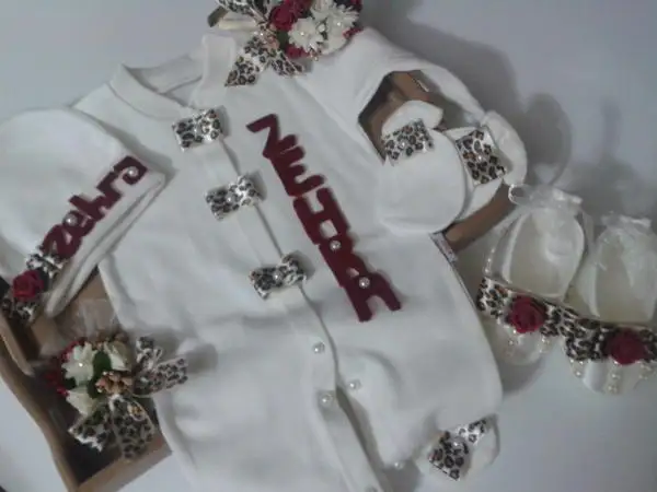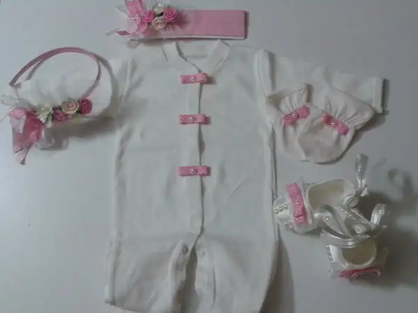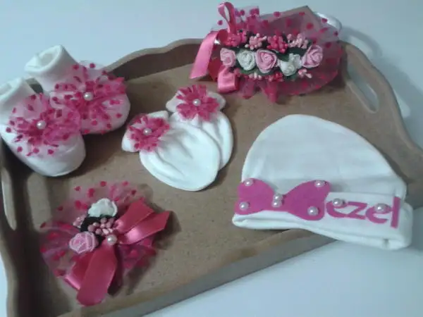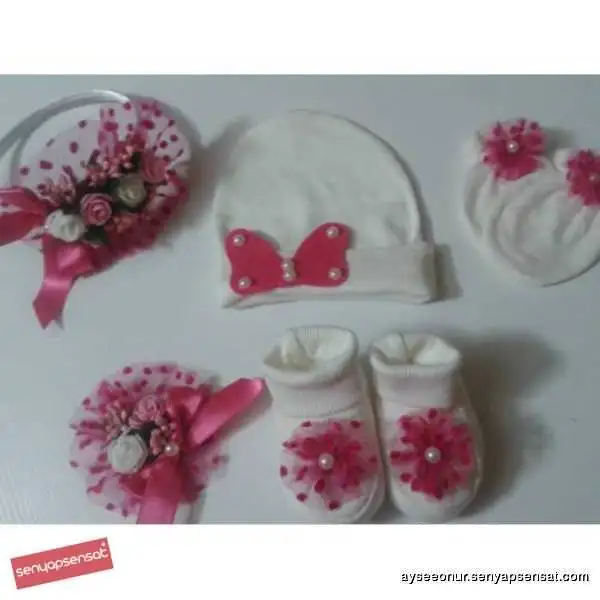Benim de ilk dikkatimi çeken lohusa terliği ve şapka-eldiven-patik beyaz-pembe kurdaleli bi üçlü vardı, onlar oldu.