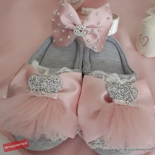 canım ben o gri terliğn ekrusundan istiyorum ama pembesi ordaki gibi pudra değilde şeker pembesi olsun istiyorum.tatlım birde taç terliğin yanında ben aynı modelde bebek bandı ve baba broşu da yaptıracağım.yapabilirmisin