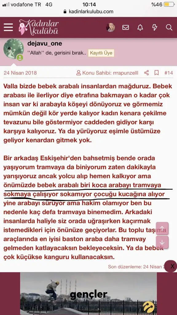 Bazıları bilerek yapmazken bazıları da böyle zorla önüne geçmek filan için bebek arabasını itip çarpıyor geçen bana marketten kasada oldu insan bi özür diler dimi görüyor öyle bakıyor boş boş
