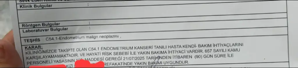 Yok canım maalesef, ablam sekreterle görüştü. İstediğim şekilde “hayati tehlikesi vardır şu kişi bakacaktır” şeklinde yazmam mesuliyet kabul etmem sadexe “bakıma muhtaçtır refakat edilmesi gereklidir” şeklinde veririm dedi. O da işime yaramıyor maalesef
