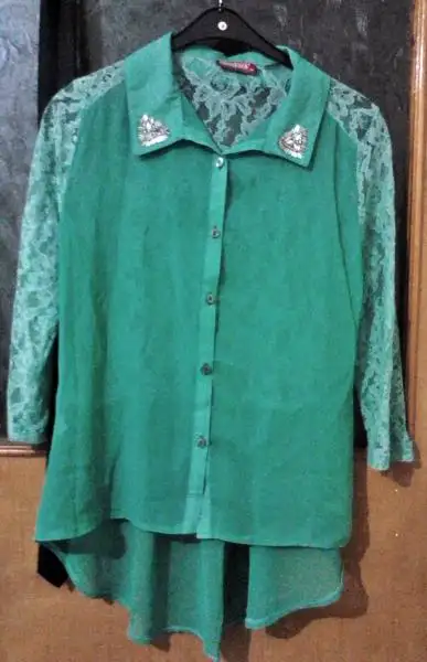 11-Su yeşili şifon gömlek, arkası ve kolları dantelden oluşuyor.Yakasında gümüş renginde detaylar var.Arkası uzundur.42 beden dar kalıp:
