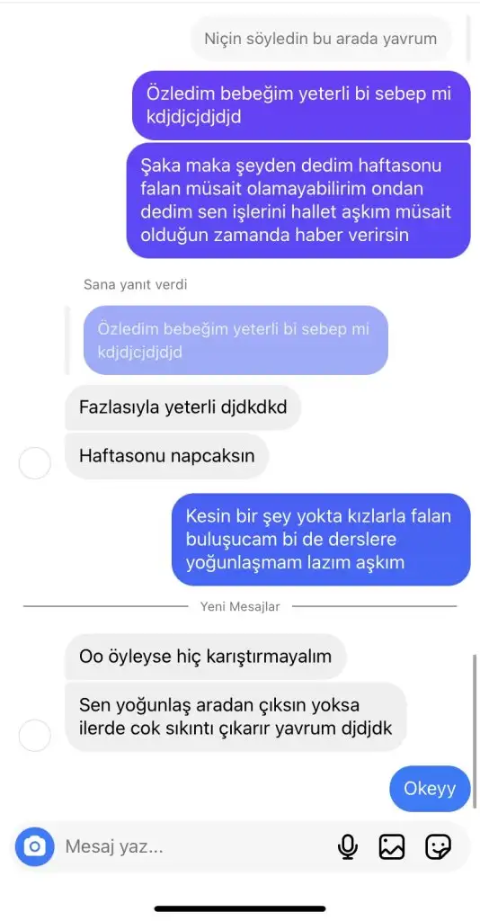 Bence yavrum derken kötü emellerinin sinyalini veriyor. Sen derslerine yoğunlaş derken de hani sen derslerle uğraş ben de başka kızlarla takılayım demek istiyor.. Tekirdağ konusuna hiç girmiyorum bile, tüylerim diken diken oldu...Erkek arkadaşımla konuşmalarımı atıyorum. Ben mi abartıyorum yoksa buluşmak mı istemiyor sizce