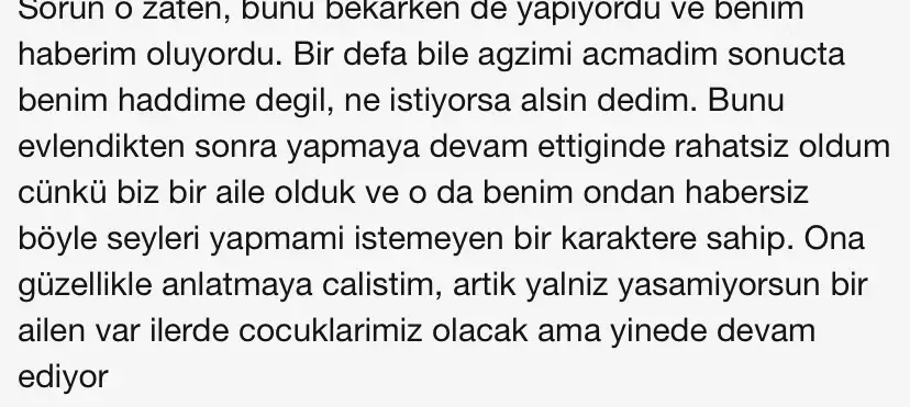 ( ben ondan izinsiz aileme maddi destekte bulunsam kızar ama o bana gelince kafasına göre davranıyor kısmı için diyorum )
