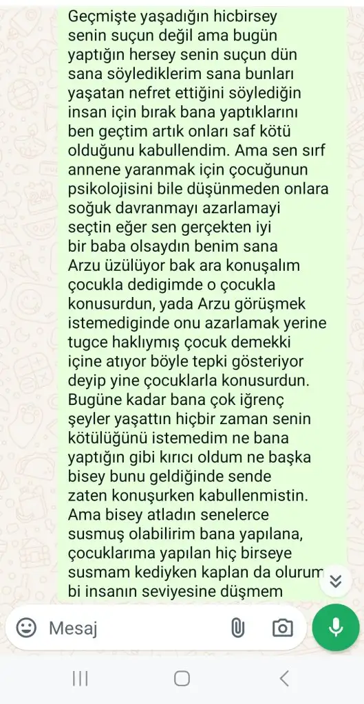 Ağzına sağlık sana dert olacağına ona dert olsunBirçok kişi eski konularimi hatırlar ben ( Eski) eşimden ayrıldım bir kaç ay oluyor. 1 hafta kadar önce de numaramı değiştirdim muhatap olmak istemediğim için. Cocuklar ablamın telefonundan babalarını arıyorlar konuşuyorlar. Büyük kızım babannesiyle görüşmüyor bana yaptıklarını gördüğü şahit olduğu için istemiyor babasi da biliyordu. Ayrılmadan önce de konusmuyordu cunku babannesiyle. Hiç birimiz gorusmuyorduk. Küçük kızım dün babasını aramış ben isteydim babannesiyle konuşurken ablam senle konuşmamı istemiyor demiş.. neyse