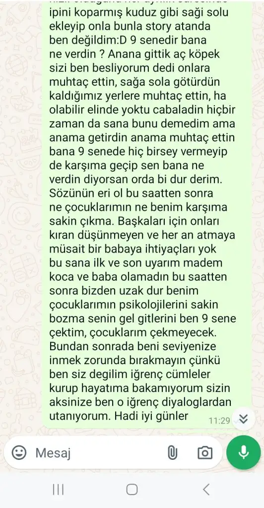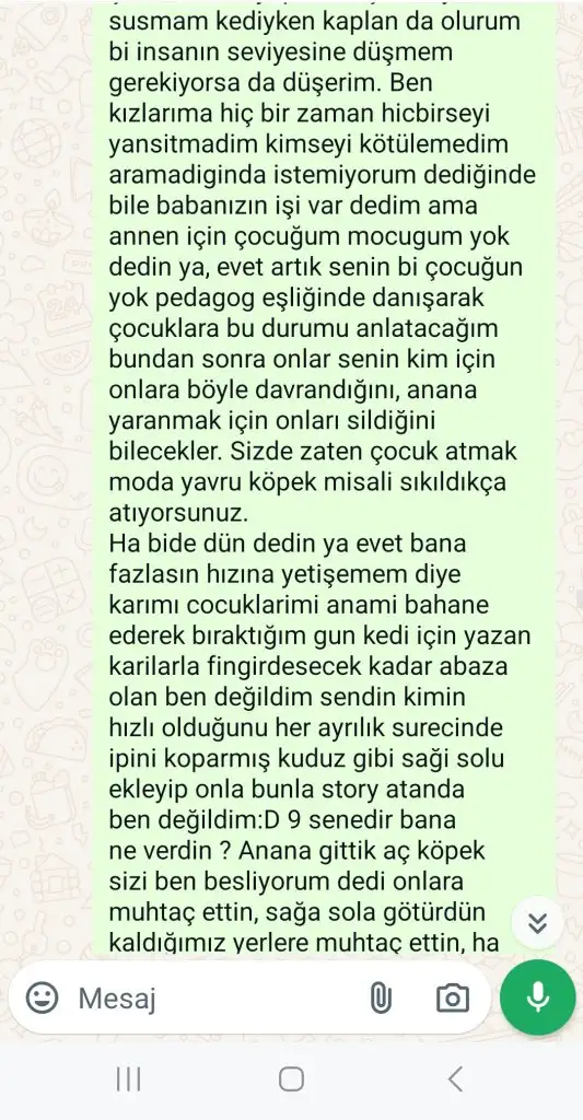 Bugun de ben ise gidecektim o sırada yine aradı görüntülü çocukla soguk soğuk kon ustalar, babasi küçük kızıma birsey sordu büyük olan cevap verince sana demedik dedi babasi ( babannesiyle gorusmemesi için kardeşini dolduruyormus diye ) bende duyunca sinirlendim kapattım telefonu mesaj attım. Anan için bırakıp gittiğin yetmiyor bide bu çocukları mı azarliyosun diye. Madem o kardeşini dolduruyor konuşmamak için aratma lan bundan sonra çocukları yok çocuğum mocugum benim dedi. Anasına yaranmak için bir daha gorussmeyecekmis bebelerle