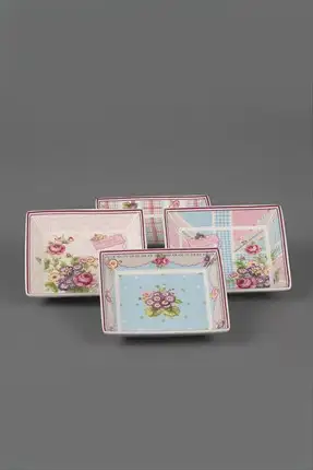 daha önce çay tabağı, şekerlik ve pasta tabağı diye aldığım mikasa moor merry'nin pasta tabağı sandığım şeyleri küçük kare çerezlikmiş ben de hem o çerezlikleri göndermeye kıyamadım hem de seri yarım kalmasın diye pasta tabaklarını da altım 6 tane seri şöyle oldu;