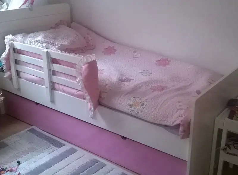 Yatağın ayak ucunu bıraz yüksek yaptırdım düşme riski olmasın yuvarlanıp diye,deli yatar. Korkuluk biraz daha uzun olmalıydı ama uğraşamadım tekrar. Rahat inip çıkıyor. Bende çok alçak bir yatak alacaktım ama yavrulu karyola cazip geldi,ileride yatak koyup arkadaşı,kuzeni yatabilir. Birde takımı özel yaptırınca uzun vadeli olacaktı yeniden değiştirmemek için büyük yatak aldık. Odasını seviyor biz beraber seçtik her şeyi ondan çok mutlu oldu.
