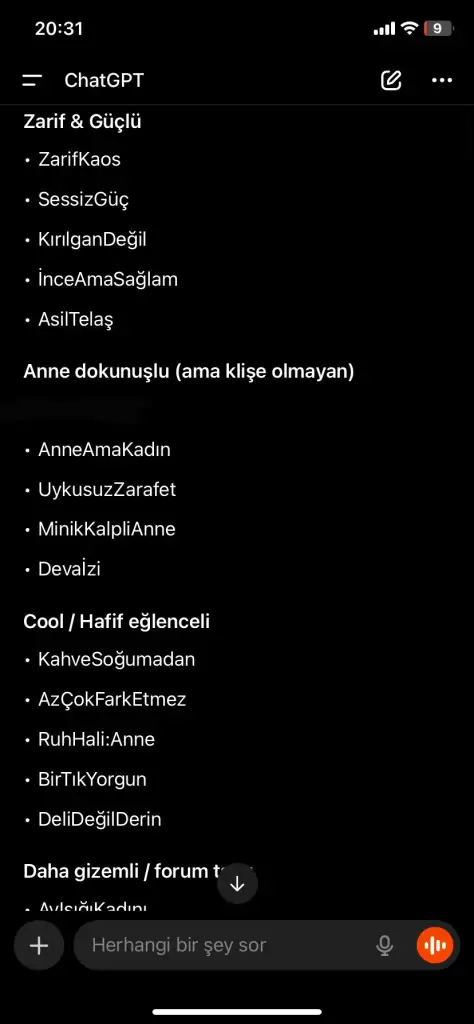 Niye yaaaa dedim bulun dedim kimseden ses cıkmadı bende chatgbtye sordum chatciğim buldu bana birdünya liste cıkardı hiçbirini beğenmedim en sonunda diyodu sen bence nick istemiyosn ahahahhaŞaşırdım![]()