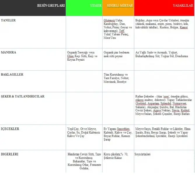 * Sağlıklı ve dengeli bir diyet çok önemlidir. Diyet öncelikle glütensiz olmalı ve şekeri, tatlıları, abur cuburları, hızlı yiyecekleri, işlenmiş yiyecekleri, süt ve peyniri, buğdayı ve sağlıksız yağları yok etmelidir. En iyi yağlar hindistancevizi ve zeytinyağıdır.