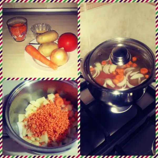 Soğan, havuç, patates ve mercimeği bir tencereye alıp üzerine 5sb su ekliyoruz ve ocağa alıyoruz. Patatesler ezilecek kıvama gelene kadar pişiriyoruz.