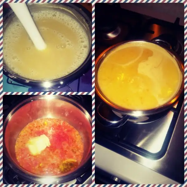 Ocaktan aldığımız çorbayı blenderdan geçiriyoruz. Başka bir tencerede zeytinyağı ,tereyağı ve rendelenmiş domatesi domatesler eriyene kadar kavuruyoruz.Üzerine blenderdan geçirdiğimiz çorbayı ilave ediyoruz.Tarhanayı da çok az su ile sulandırıp çorbanın üzerine ilave ediyoruz.Sulandırma sebebimiz topaklanmasını önlemek için.