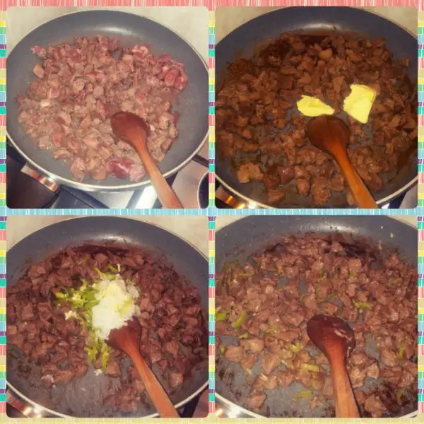 Kuşbaşı etlerimizi iriyse biraz daha küçülterek tavaya alıyoruz ve suyunu salıp tekrar çekene kadar tavada döndürüyoruz.Suyunu çeken etlerimizin üzerine tereyağını ekliyoruz.Daha sonra rendelenmiş soğanımızı,ince kıyılmış biberimizi ve rendelenmiş sarımsağımızı ekliyoruz ve biraz daha kavuruyoruz biberlerde renk değişimi olana dek.
