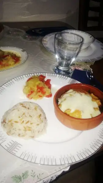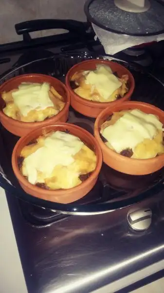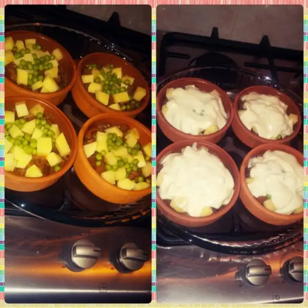 Güveçlere önce sotelediğim eti,üzerine de bezelye ve küçük küçük doğradığım patatesi ekliyorum.En üst kısmına da beşamel sostan döküp 180' fırına veriyorum. Üzeri kızarana kadar pişiriyorum.