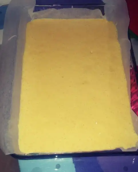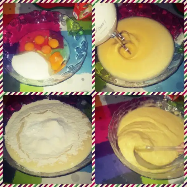 Yumurta ve şekeri bir kaba alıp boza rengi alana dek çırpıyoruz.Üzerine unu,kabartma tozunu ve vanilyayı ekleyerek spatula yardımı ile dıştan içe doğru hamuru söndürmeden unu yediriyoruz..