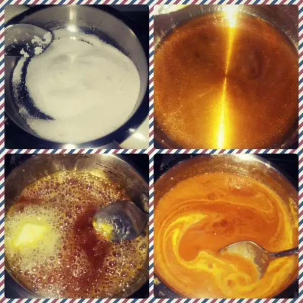 Şekeri tavaya alıyoruz ve eriyene kadar sürekli karıştırıyoruz. Kahverengi sıvı hale gelince üzerine tereyağını ekliyoruz,güzelce karıştırıyoruz. Son olarak sıvı kremayı da ekleyip yediriyoruz,biraz kaynatıyoruz. Ve sogumaya bırakıyoruz.