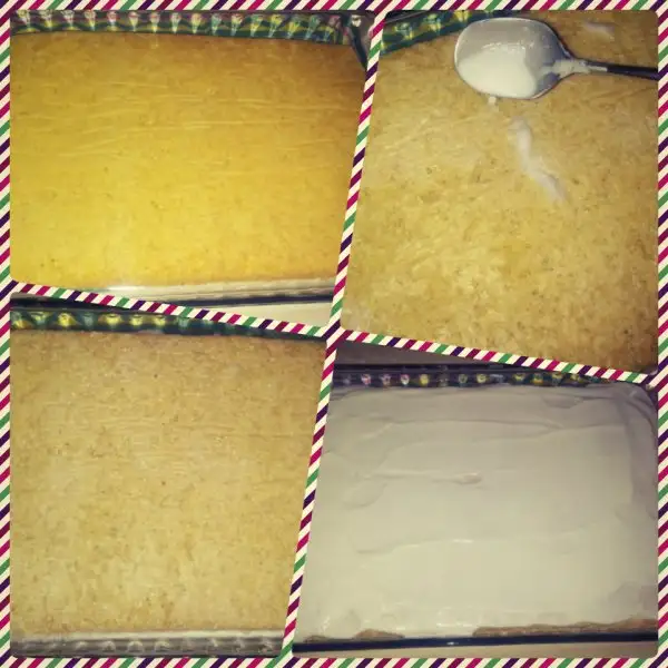 Pişen ve ılıyan kekimizi ters çevirip yağlı kağıttan ayırıyoruz. Çatalla üzerine delikler açıyoruz ve dolaptan aldığımız sütlü şerbetimizi iyice ıslanmasını sağlayacak şekilde üzerine döküyoruz.