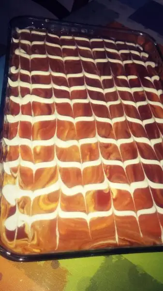 En üzerine de ılıyan karamel sosu ekleyip krem santiyle çizgiler atıyoruz ve kürdanla şekil veriyoruz.5-6 saat dolapta dinlenmeye bırakıyoruz.